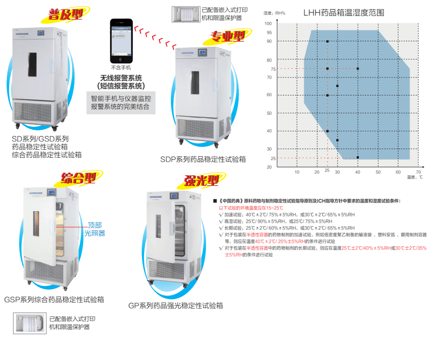 1、SD、SDP、GSD、GSP、GP標配485接口/嵌入式打印機 2、SDP、GSP標配USB接口/無線報警系統SD、GSD、GP系列選配 3、GP、GSD、GSP系列,手動無極調光,標配光照度監測儀,內置頂部光照器 4、GP、GSD、GSP系列,可選配二層光照器 5、LHH-80SD、LHH-80SDP為一組獨立原裝全封閉進口壓縮機 |